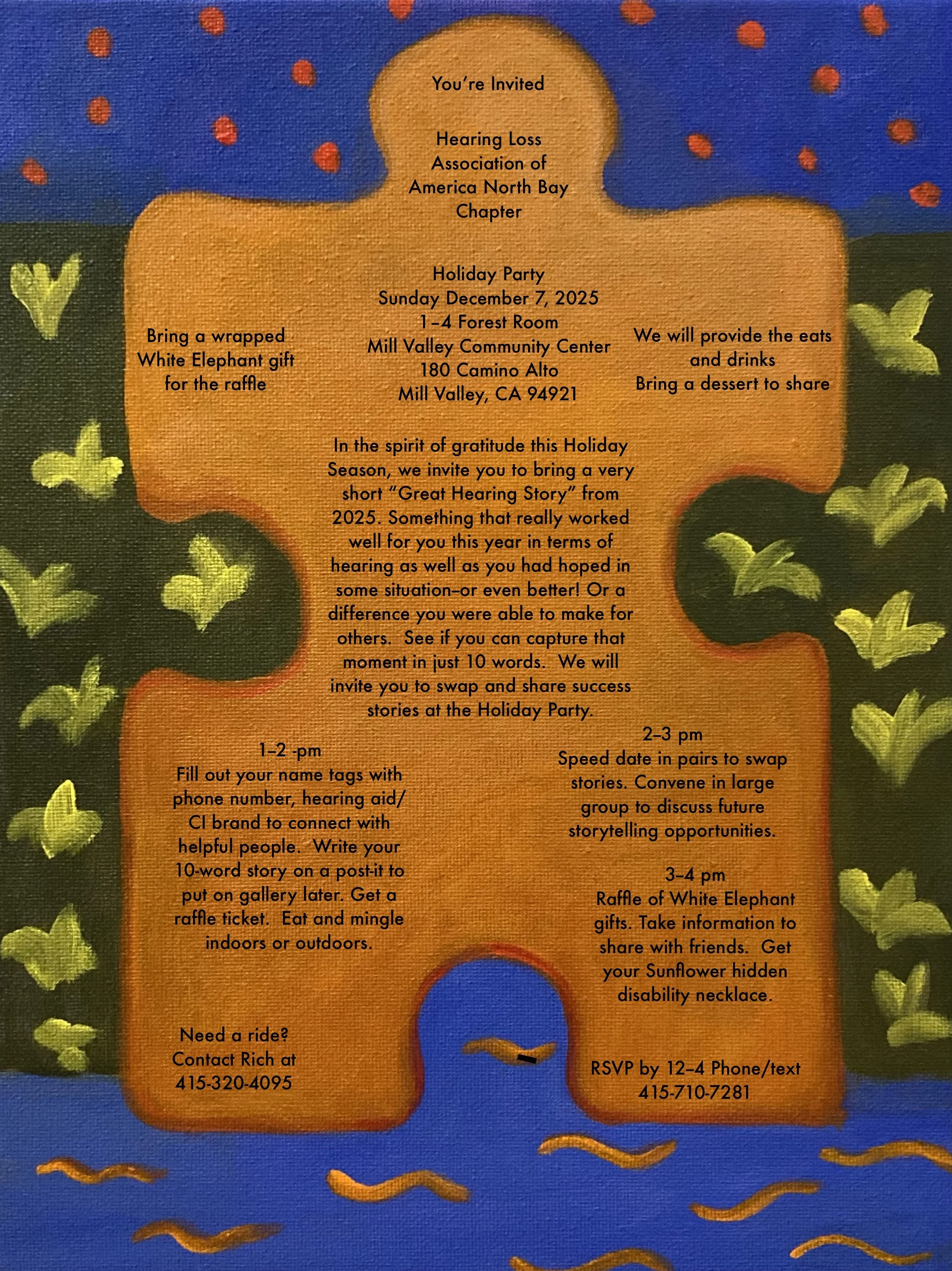 12-7 1-4 Holiday Party in Forest Room at Mill Valley Community Center. Thank you to Jane Kiskiddon for the art.